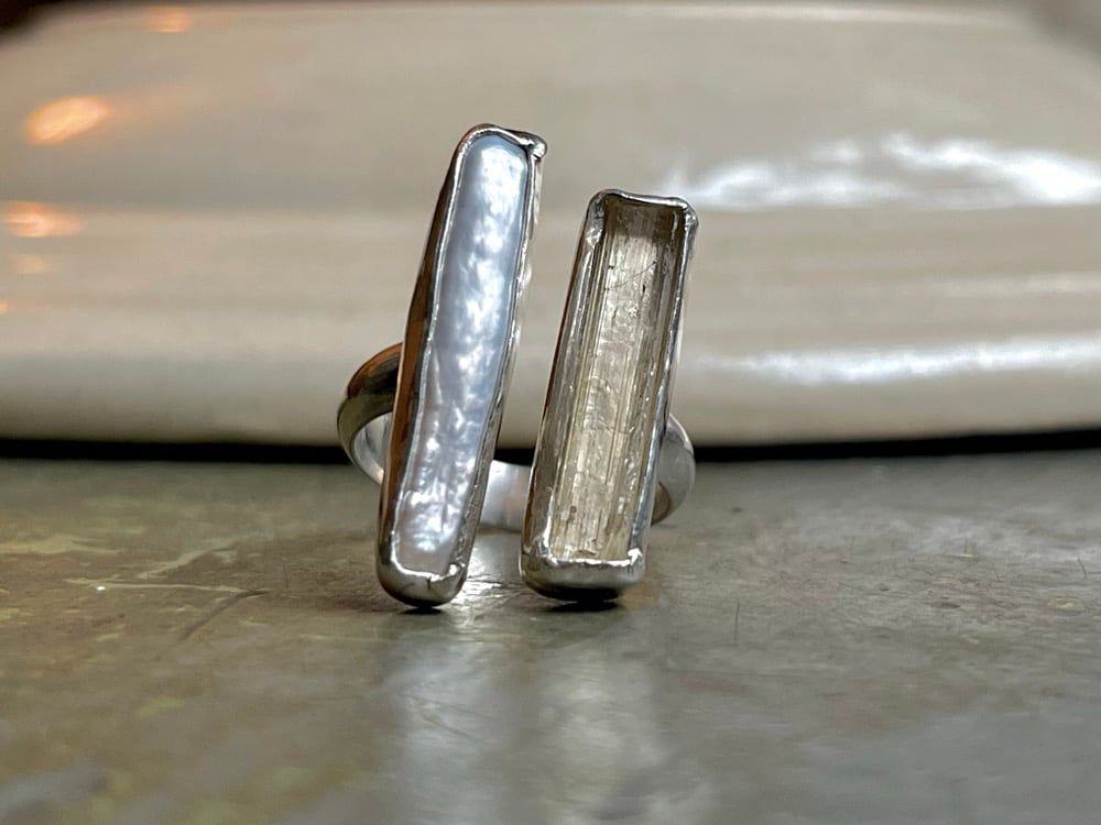 Adjustable double ring with a long Biwa pearl in silky white and a champagne-colored raw topaz. When worn on the finger, the geometric, parallel arrangement of the settings radiates elegance and strength.