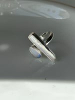 The pearl with its setting measures 2.5 cm. The ring band is 4 mm wide.