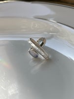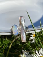 Eine lange, pfirsich-rosa schimmernde Biwaperle und ein australischer Opal zieren diesen verstellbaren Doppelring. Den Opal durchzieht ein Schauer von violetten umd türkisen Funken, sein milchiger Grundton leuchtet im Licht rot-orange. Am Finger getragen, strahlt die parallele Anordnung der Fassungen Eleganz aus, wobei die spielerische, verträumte Zartheit der Farben von Stein und Perle hierzu einen schönen Kontrast bildet.