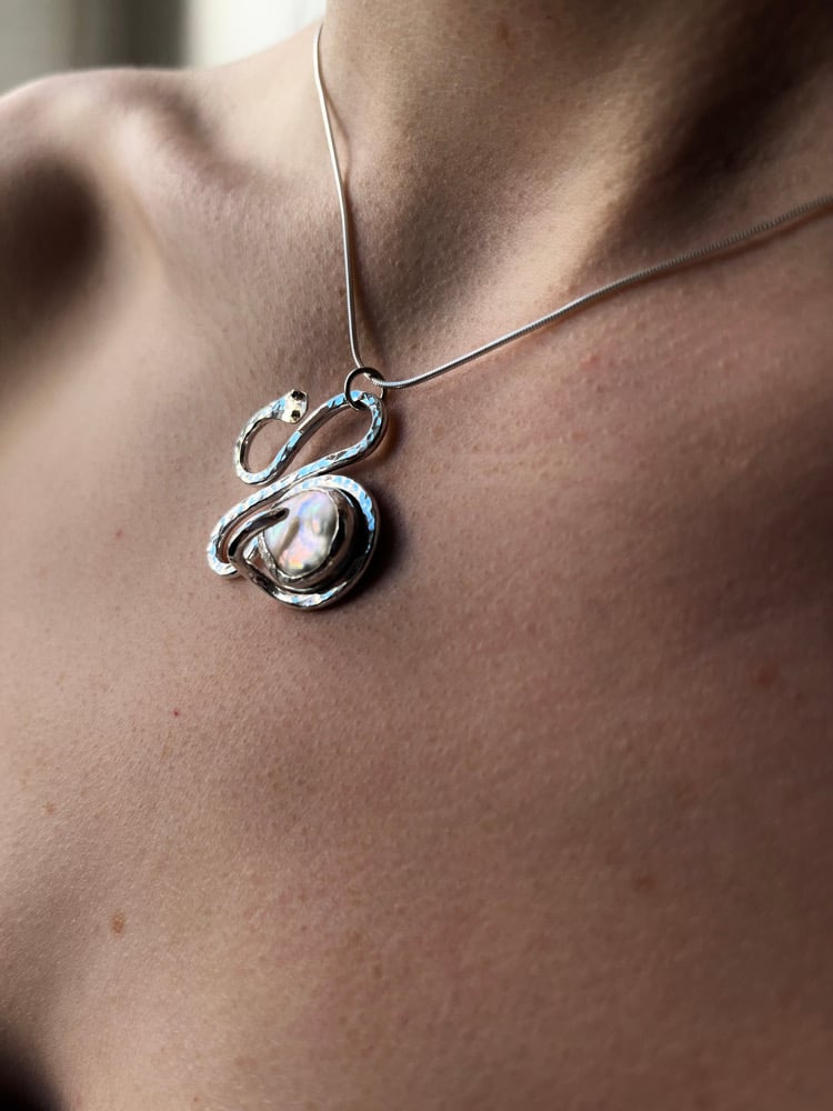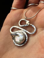 Die Schlange ist aus gehämmertem Sterling Silber, ihre Augen kleine Kugeln aus 9ct Gold. Das Ei ist eine bunt schimmernde Keshi-Perle, gefasst in Feinsilber. Getragen wird der Anhänger von einer zarten Schlangenkette.