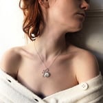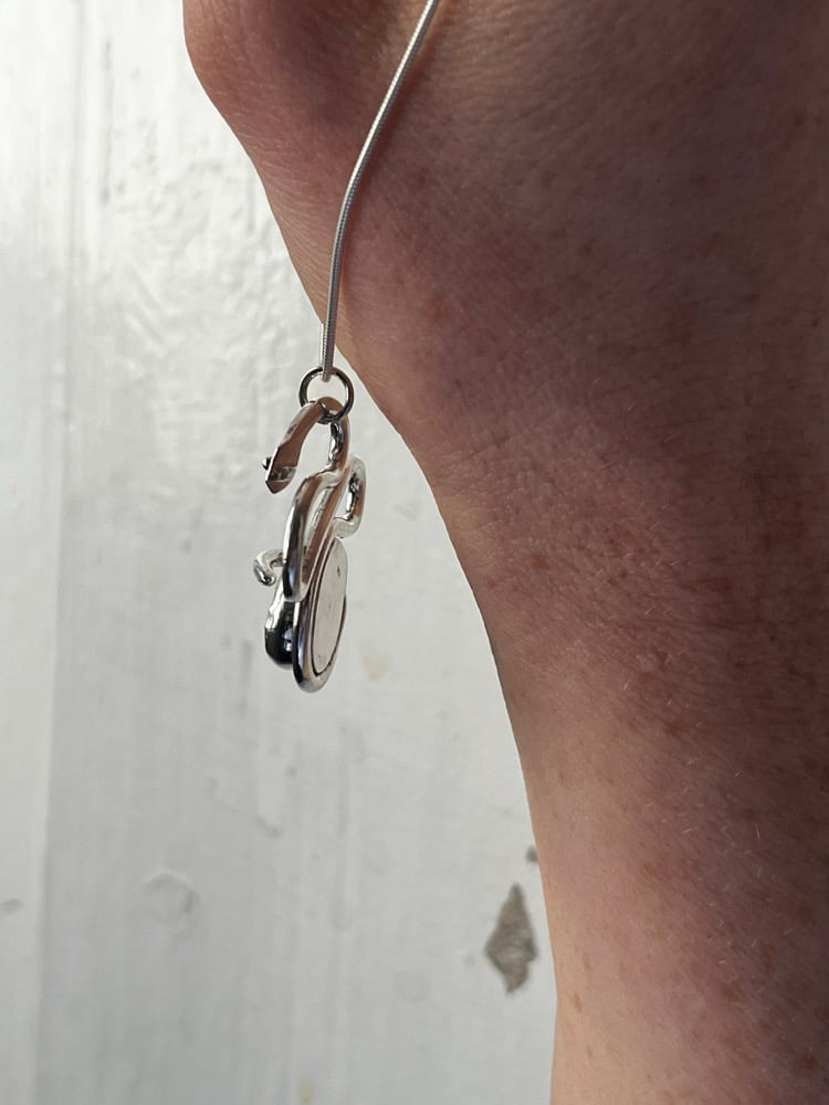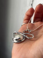 The snake’s made of hammered sterling silver, her eyes little balls made of 9ct solid gold. The egg is a vibrantly shimmering Keshi pearl set in fine silver. The pendant is held by a delicate snake chain.