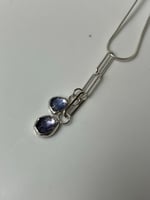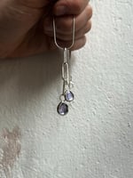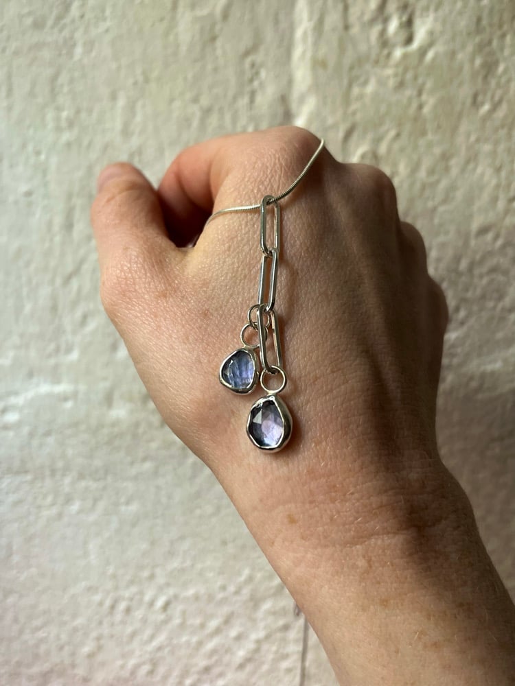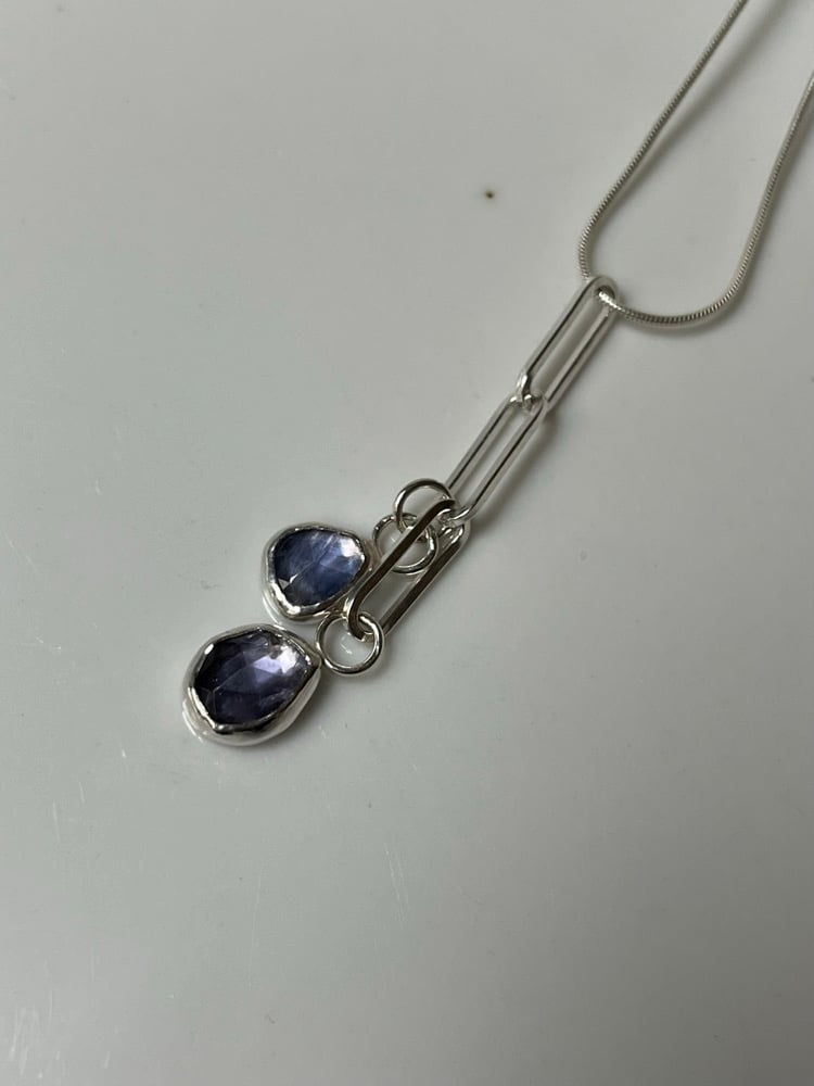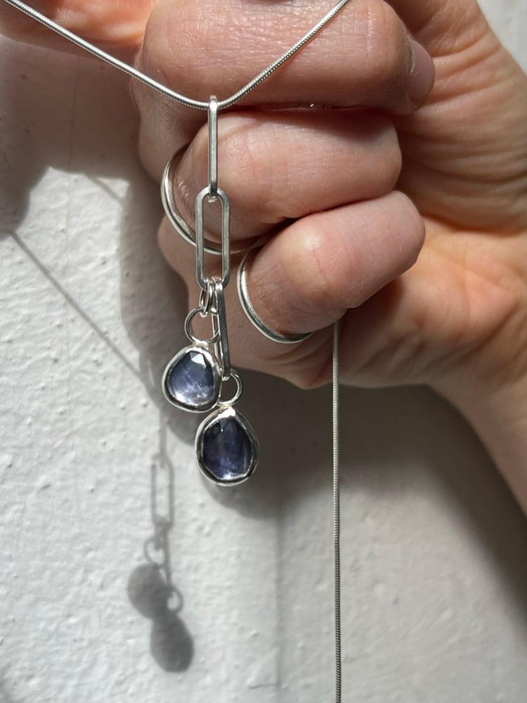 Pendant with two faceted iolite stones and paperclip chain links. The necklace features a 40 cm snake chain.