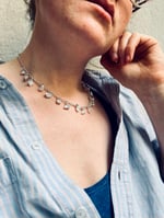 Modern, yet timeless and elegant Choker with 17 small, organically formed Keshi Pearls in shiny White and Jeweler’s Quality. This short chain is loosely hugging the neck and is a remake of the classical pearl necklace. It is Statement Piece yet suitable to be worn day-to-day.