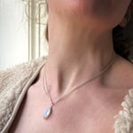 An almond shaped rainbow moonstone showing its mysterious blue color play when meeting the light. This special stone is framed by a simple shiny silver setting. The pendant is held by a short, delicate double chain, which gives the necklace a romantic touch.