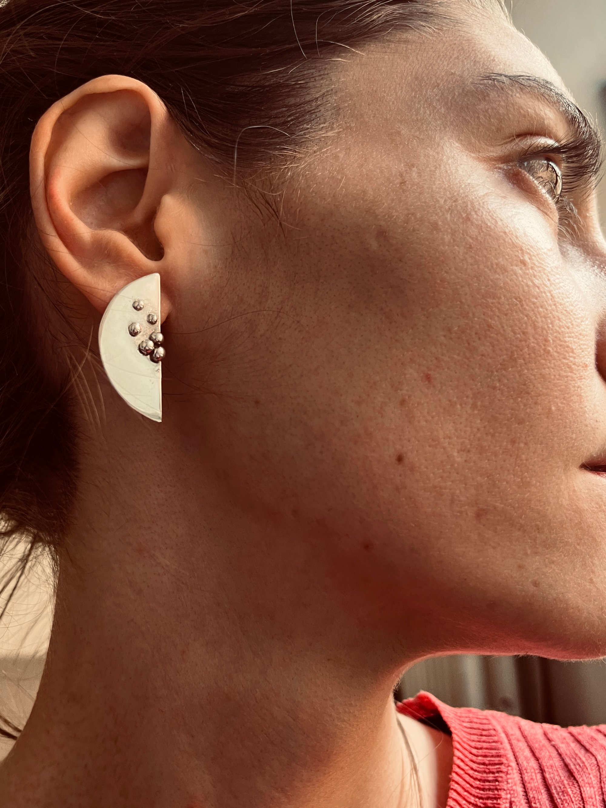 Half moon shaped studs with cute silver bubble details, made from 100% recycled Sterling Silver. These special, happy earrings make us think of refreshing, bubbly lemonade on a hot summer’s day!