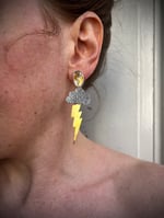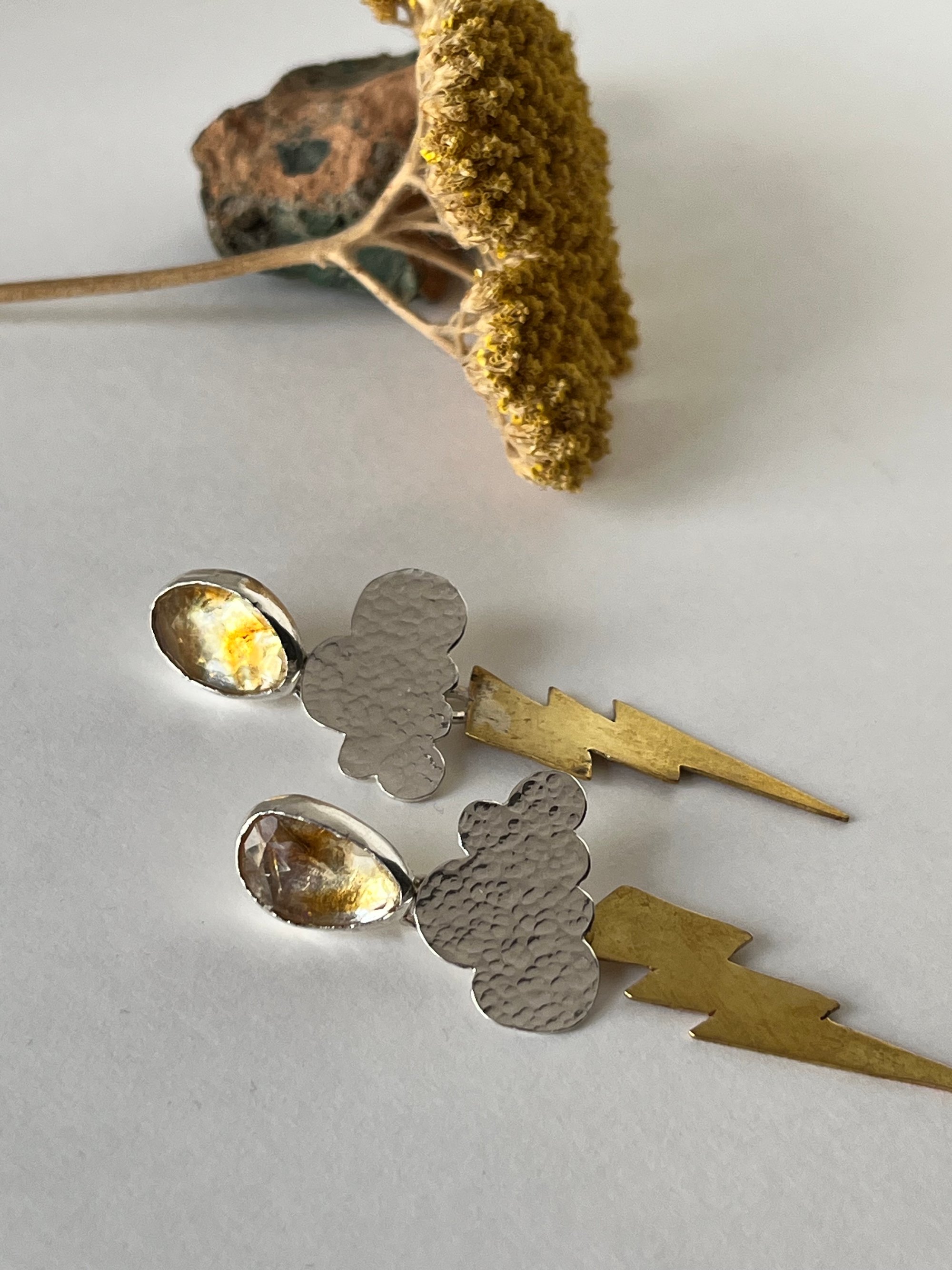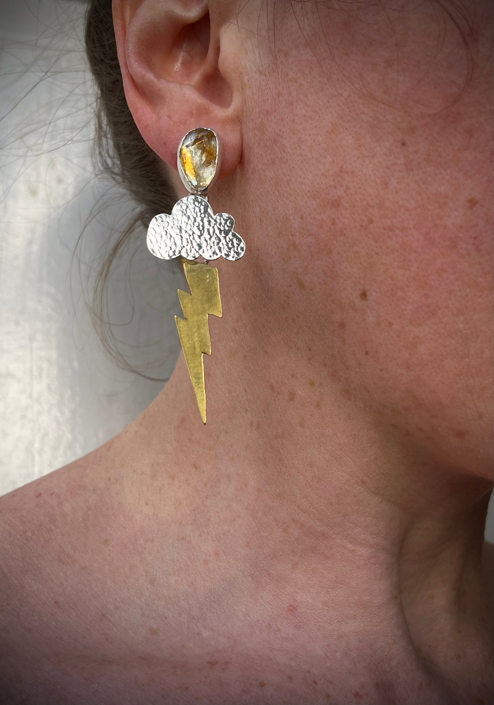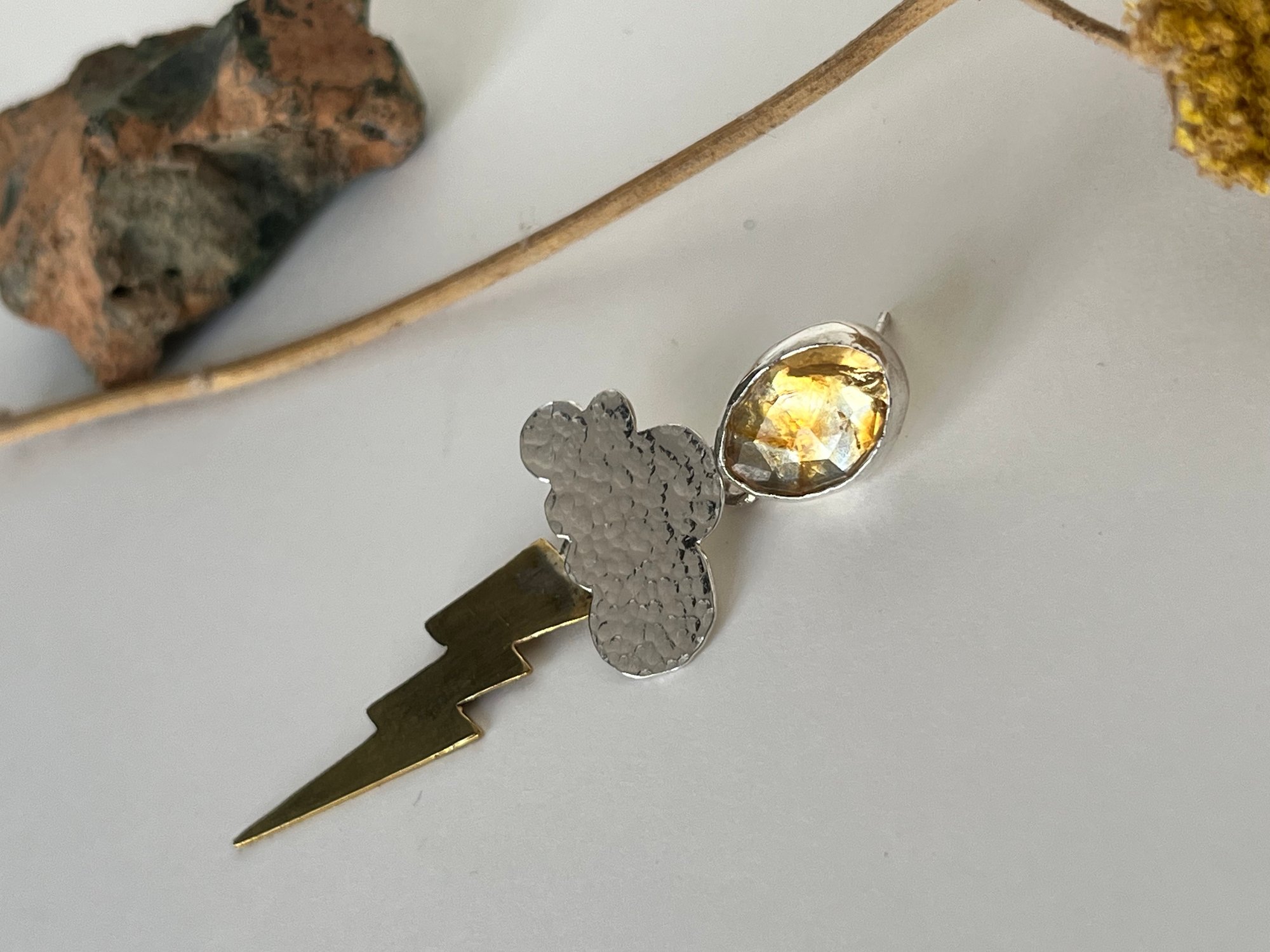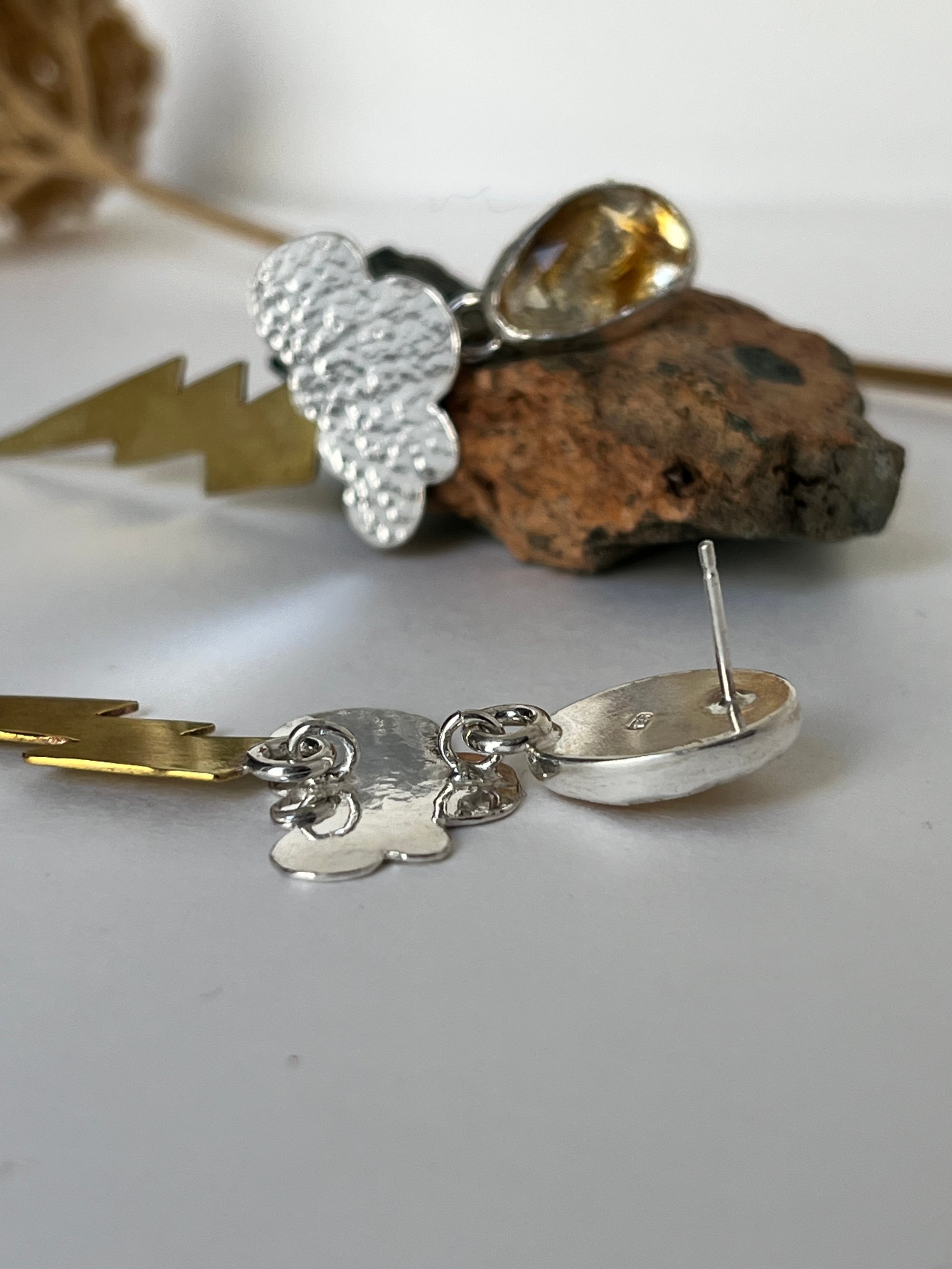 Big, graphic earrings with studs. From a hammered silver cloud a golden, pointed lightning bolt made from brass strikes. Cloud and lightning bolt both dangle from studs with asymmetric, faceted citrines, which shine bright in the light. The single elements are connected by hidden eyelets, which allows movement and makes the earring dangle beautifully.