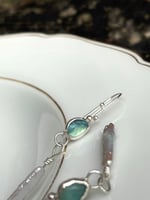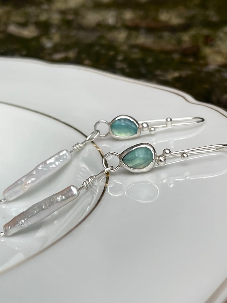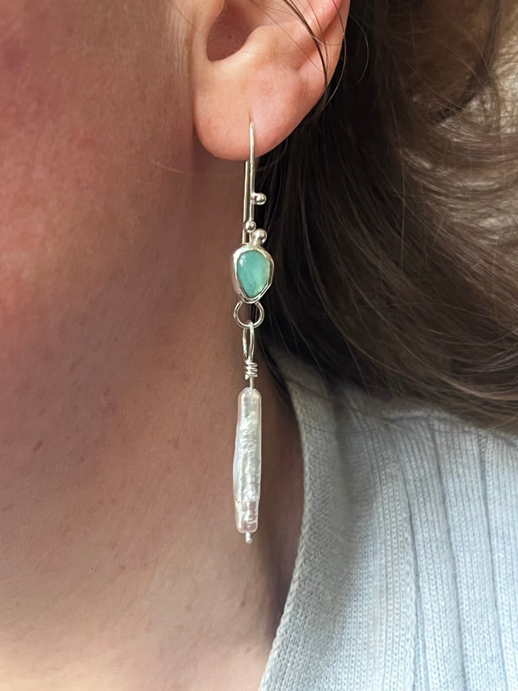 Delicate, intricately detailed hook earrings featuring radiant turquoise Peruvian opals that evoke the image of crystal clear, warm ocean waters. Two long, iridescent Biwa pearls and small fine silver bubbles complete the beach vibe.