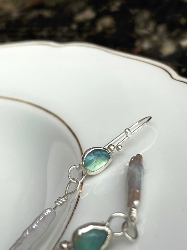 Zarte, detailreiche Ohrhaken mit strahlend türkisen Andenopalen, die an kristallklares, warmes Meer denken lassen. Zwei lange, farbig schimmernde Biwa Perlen und kleine Luftblasen aus Feinsilber vervollständigen den sommerlichen Vibe.