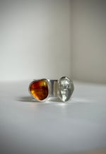This ring is all clear forms and luminous colors. It tells us stories of sun and sea and features a radiant combination of a dark honey colored Amber and an oceangreen, faceted Amethyst. Both stones are transparent and set in polished silver, which makes them glow in the light. The ringband is wide and hugs the finger comfortably.