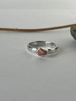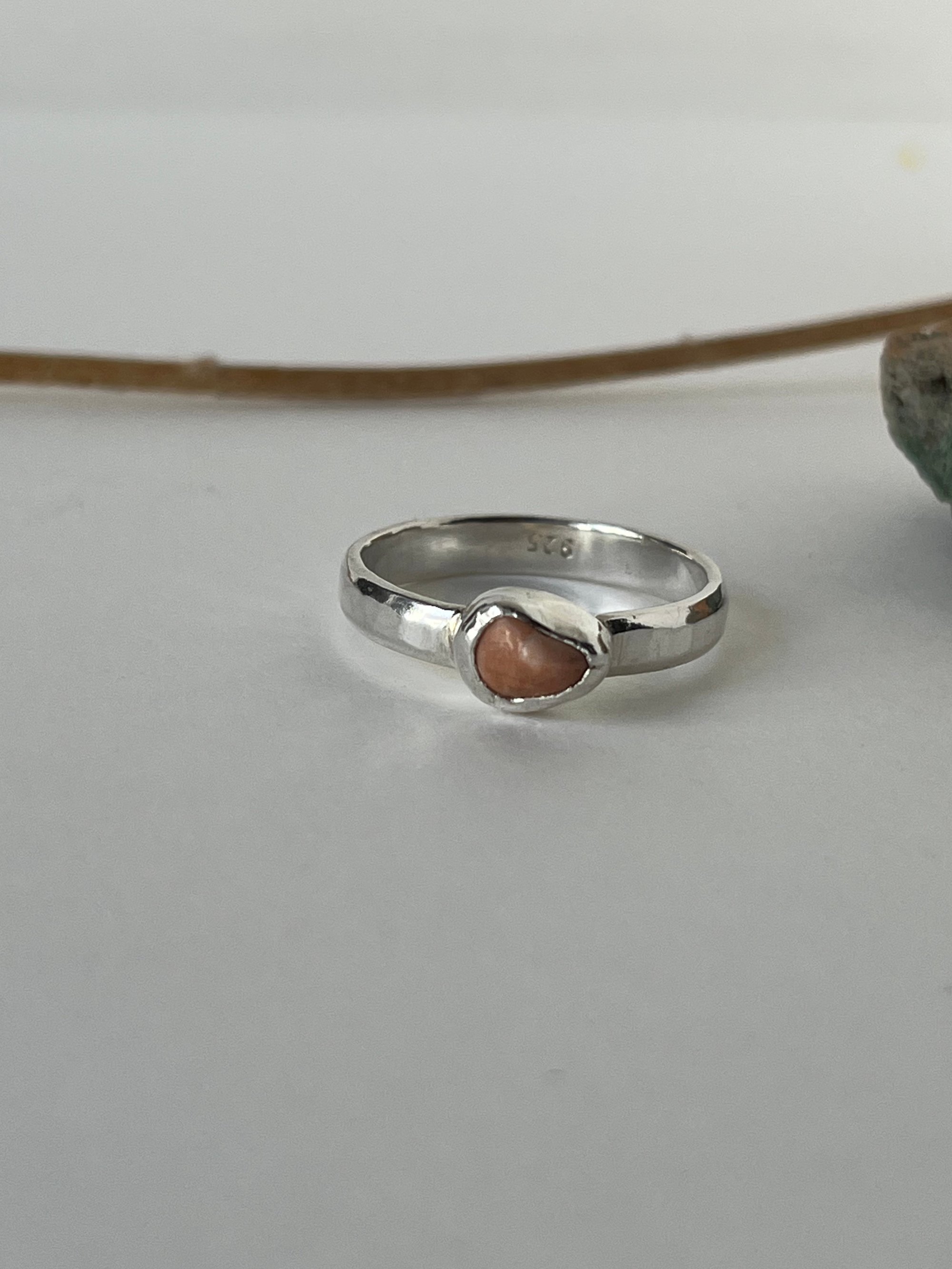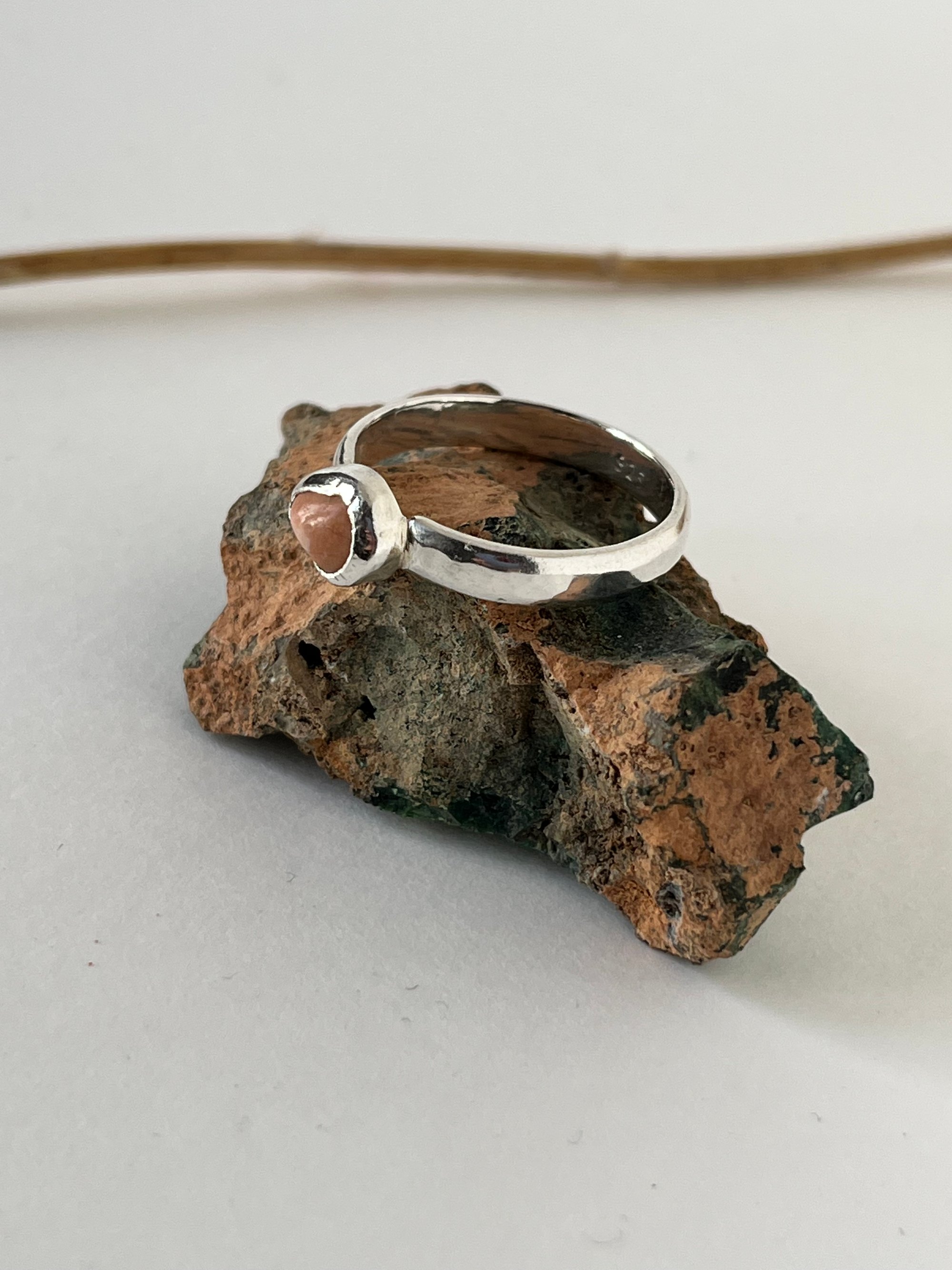An earthy ring that features a very special stone - a pebble from the Isar, the river that flows through my hometown Munich. I took the stone with me while going for a walk and polished it myself. The color is a warm, dark apricot. The stone sits on a chunky, slightly hammered ringband.