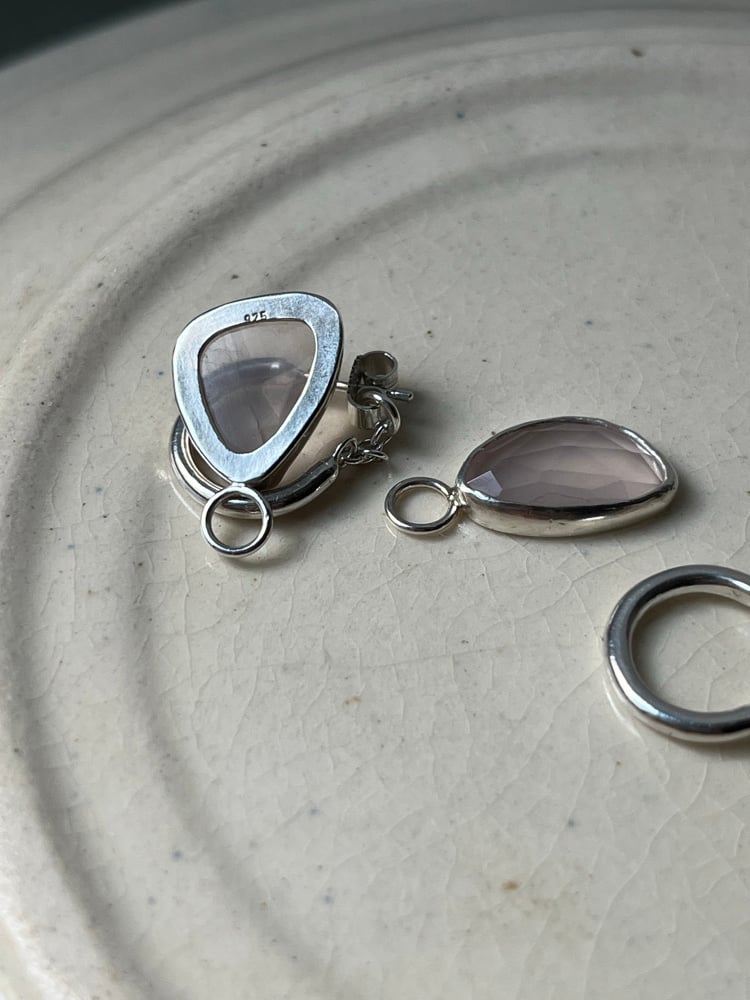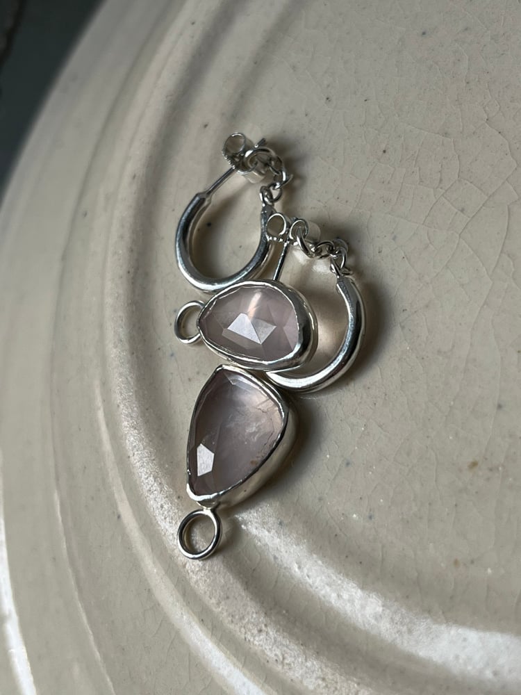 Chunky rose quartz charms in a delicate, powdery pink dangle from small chained hoops. The chain prevents the pendants from slipping off and gives the earrings an edgy vibe. The charm settings are open at the back, allowing light to pass through the semi-transparent, faceted stones - making them sparkle and shimmer beautifully.