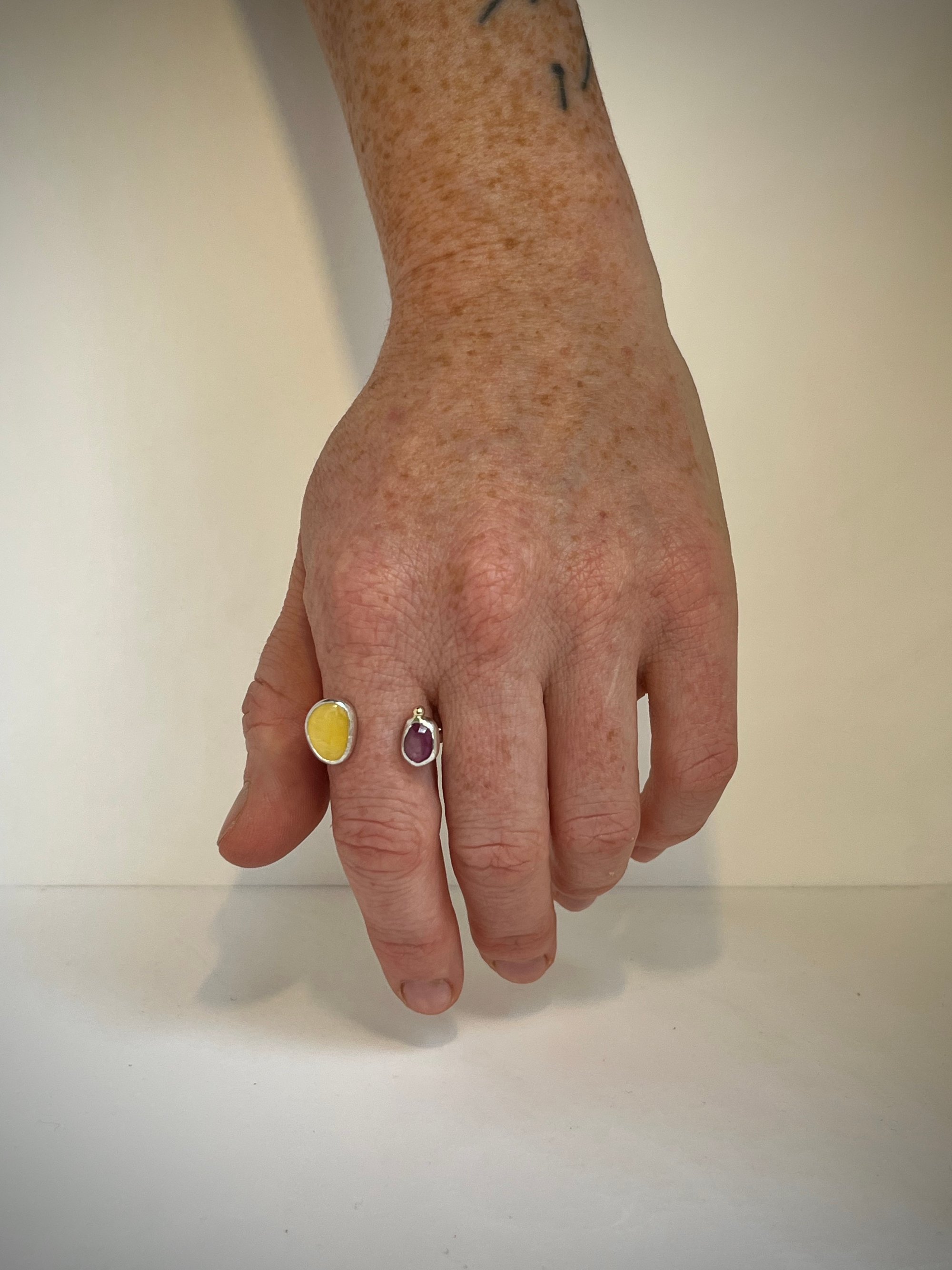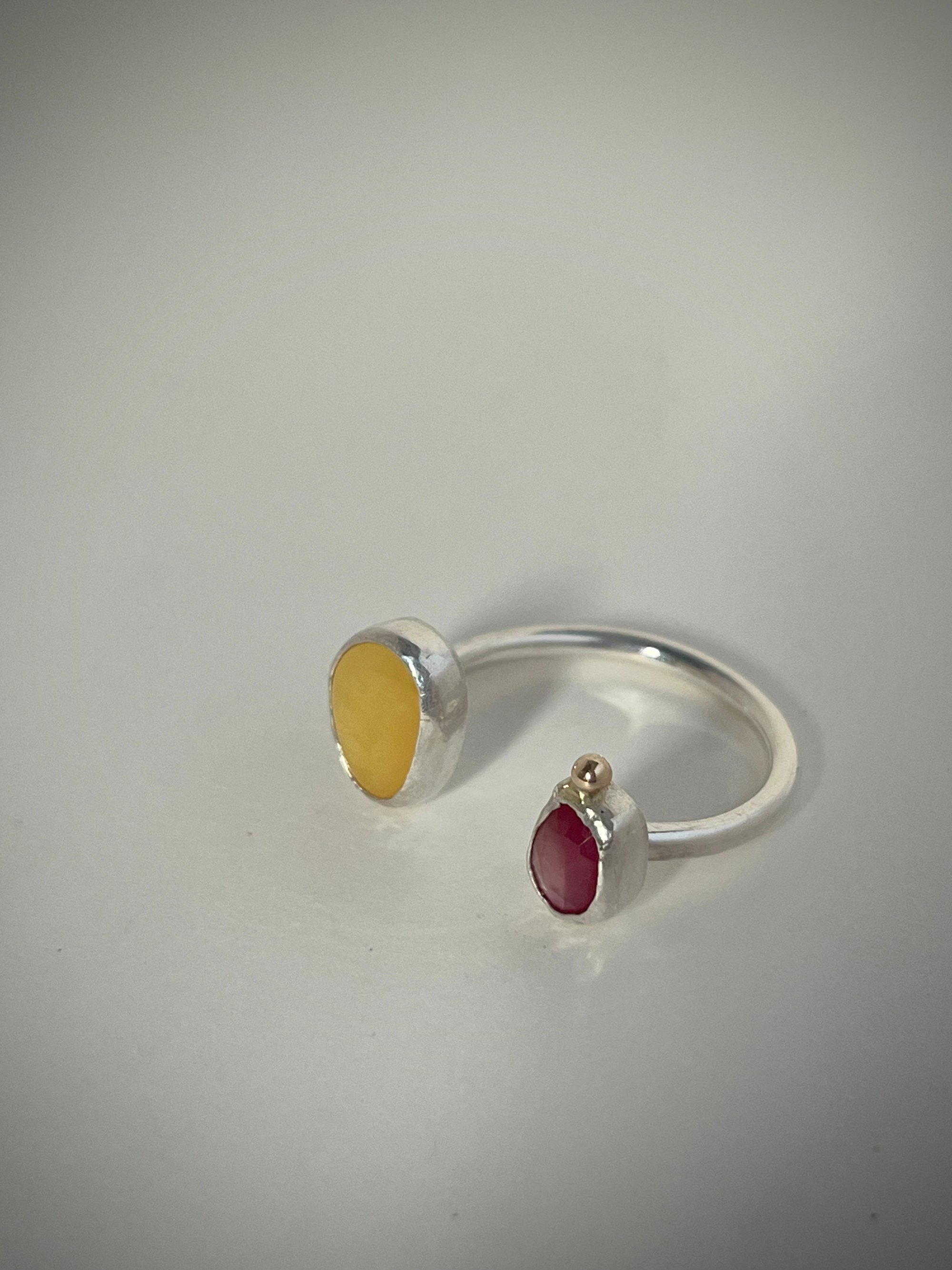 Ein in der Mitte offener Ring mit besonders fröhlicher Farbkombination - ein leuchtend pinker, facettierter Rubin und ein weicher, buttrig gelber Bernstein sitzen sich gegenüber. An der Fassung des Rubins sitzt eine kleine Kugel aus 9 ct Gold, welche einen zusätzlichen Kontrast zum Silber bildet.