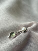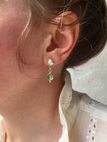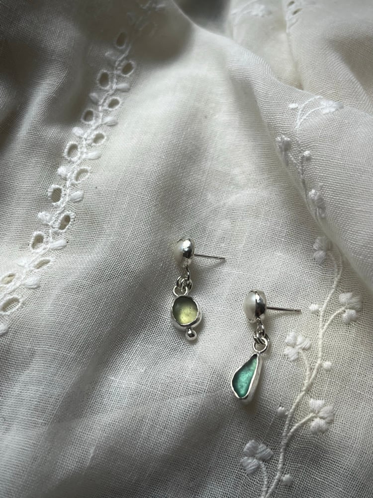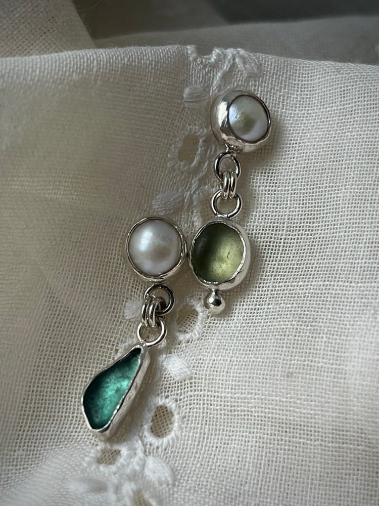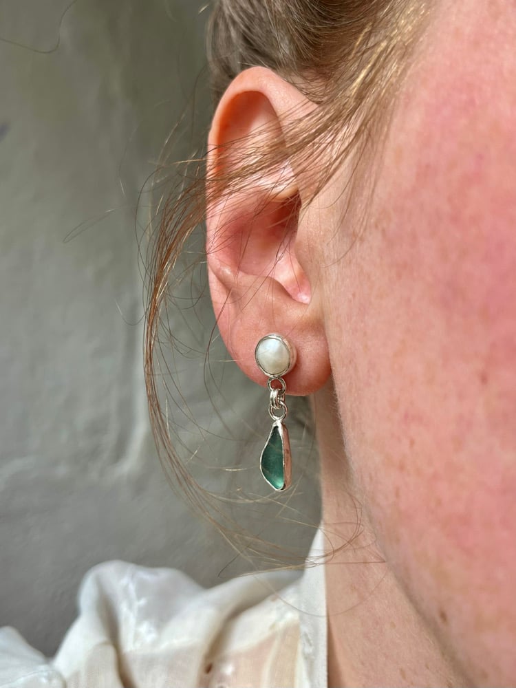 Dreamy earrings featuring sea glass in light green and petrol tones, collected along the Portuguese Atlantic coast. The glass is set in silver and dangles from small stud earrings with freshwater pearls. Both the glass and the pearls were chosen with an appreciation for their natural differences, creating a harmonious, elegant, yet intriguing and lively overall look.