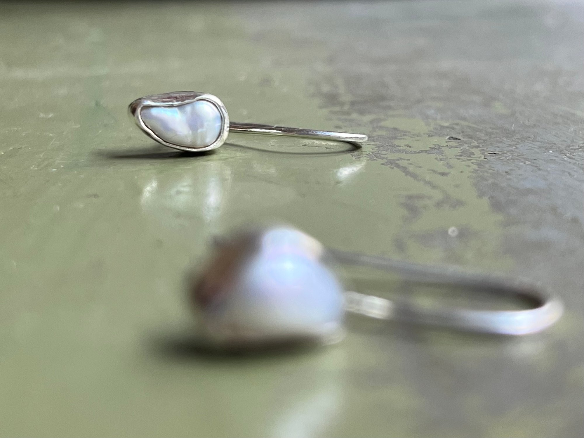Delicate, yet special earrings that feature two small, snowy white Keshi Pearls which conjure up a subtle asymmetry due to their natural shapes. Made from 100% recycled Sterling Silver.