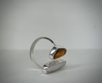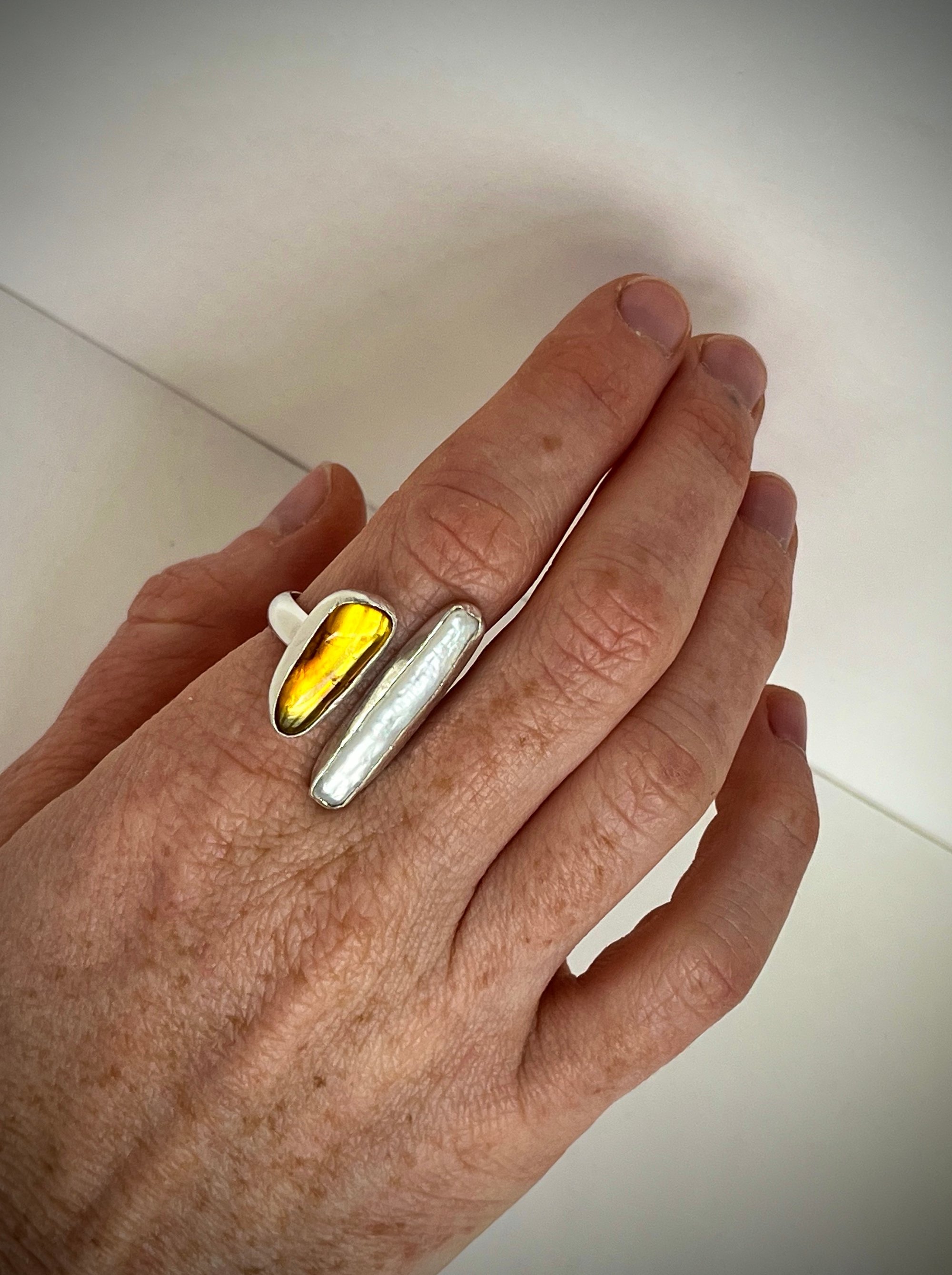 Adjustable ring with a white Biwa Pearl and a shining, honey colored amber with specks and inclusions - a lively combination of water’s treasures. The ringband is massive and comfortable to wear.