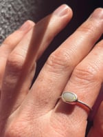 A dreamy, cute Ring with a super delicate Ringband that holds a milky, half transparent Australian opal that reveals its gold and red sparkly magic when meeting the sun.